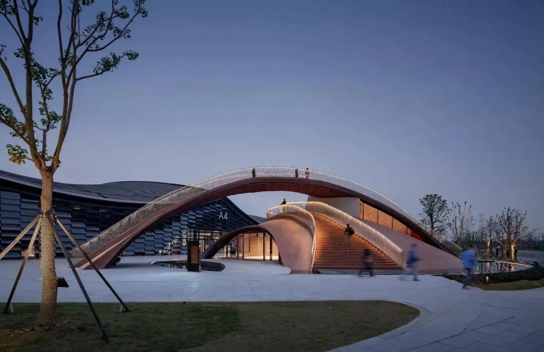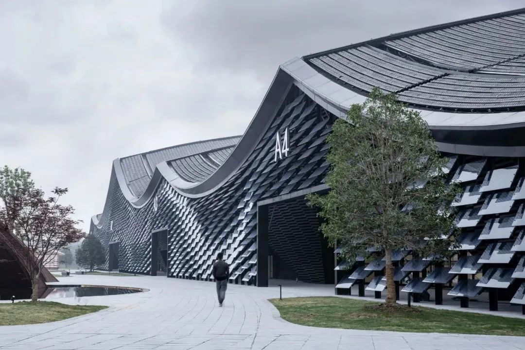 为了实现整个展馆的快速建造,动态模数系统和全预制装配的逻辑运用到整个展馆项目的整体表皮构建中来,竖向叠错的幕墙玻璃既灵动又节省工期。建筑整体也以黑白灰为主色调融入淡薄雅致的江南地域建筑。柔曲连绵的形态刚柔并济,既有江南灵秀内敛的气质,同时充满张力和激情,呈现出江南文化的诗性内蕴,传统文化与先进的结构形态在这里得以对话统一。