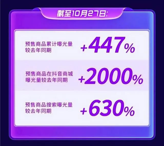 据抖音电商发布的预售战报显示,截至10月27日24点,抖音预售商品累计曝光量较去年同期增长447%;预售商品在抖音商城曝光较去年同期增长2000%;预售商品搜索曝光量较去年同期增长630%。