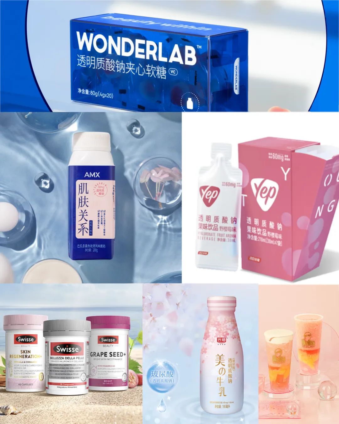 多样化玻尿酸食品,图片来源:Woderlab、伊利、汤臣倍健、Swisse、光明、乐乐茶
