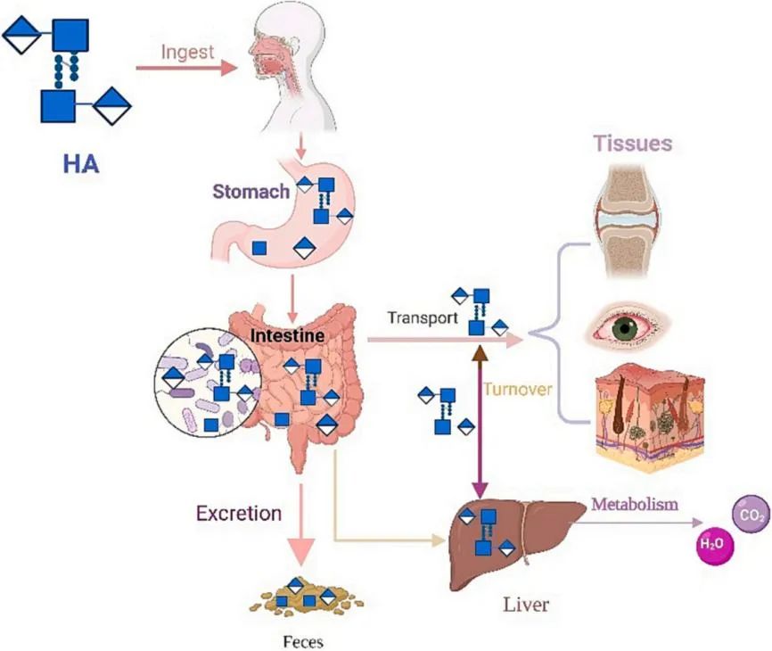口服HA的吸收途径。肠道微生物降解HA,并将其转运至肝脏进行代谢,或转运至其他组织,例如关节、皮肤、眼睛等。多余HA会被排出。
