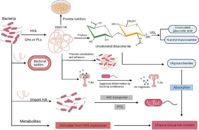 微生物与玻尿酸的复杂作用关系,图片来源:论文《经口给予透明质酸的生理功能及其作用机制研究进展》