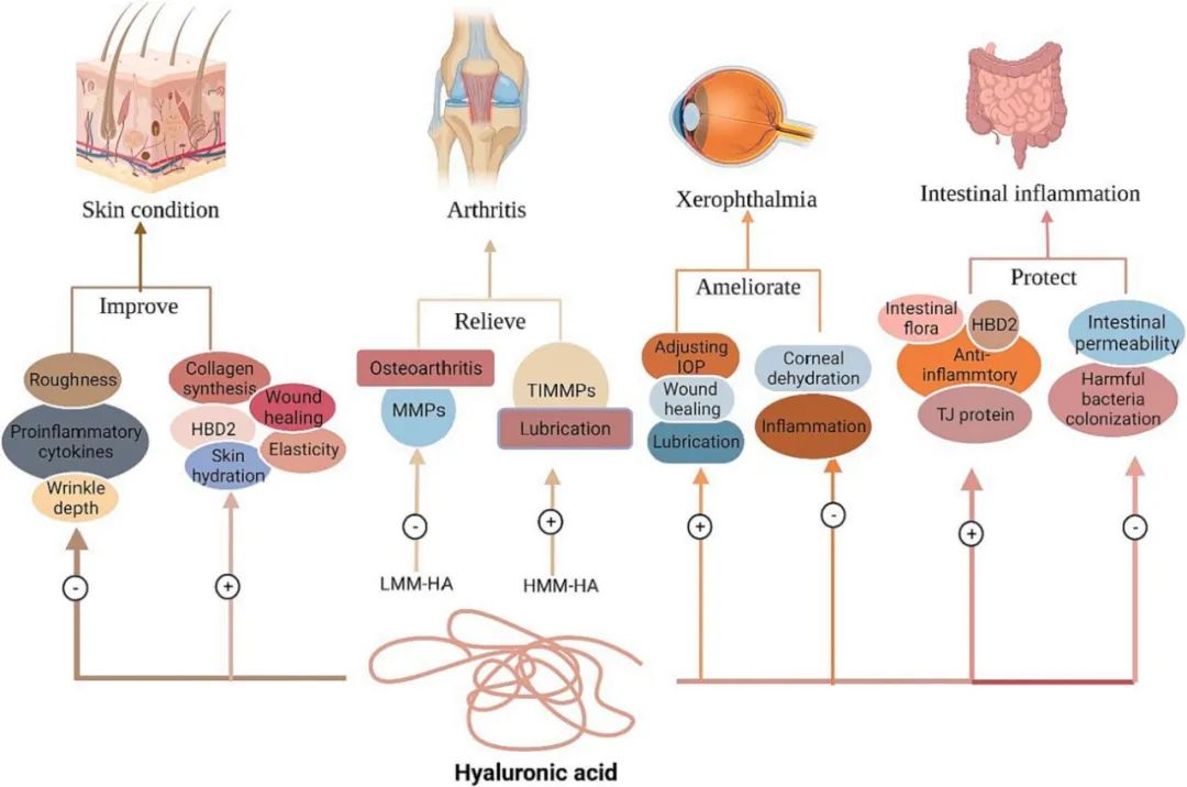 玻尿酸对皮肤、关节、眼睛和肠道的保护作用,图片来源:论文《经口给予透明质酸的生理功能及其作用机制研究进展》