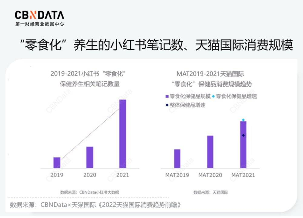 据CBNData《2022天猫国际消费趋势前瞻》报告,小红书上“零食化”养生的讨论度、天猫国际“零食化”保健品的销售规模均增长可观。