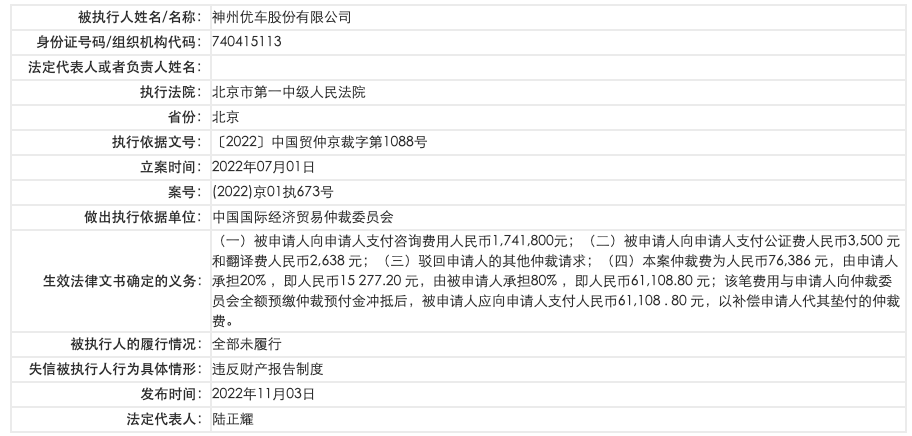 中国执行信息公开网显示,11月3日,神州优车股份有限公司因违反财产报告制度,被北京市第一中级人民法院列为失信被执行人(老赖)。生效法律文书确定的义务显示,神州优车需向申请人支付咨询费用、公证费、翻译费、仲裁费合计180万余元,神州优车全部未履行。