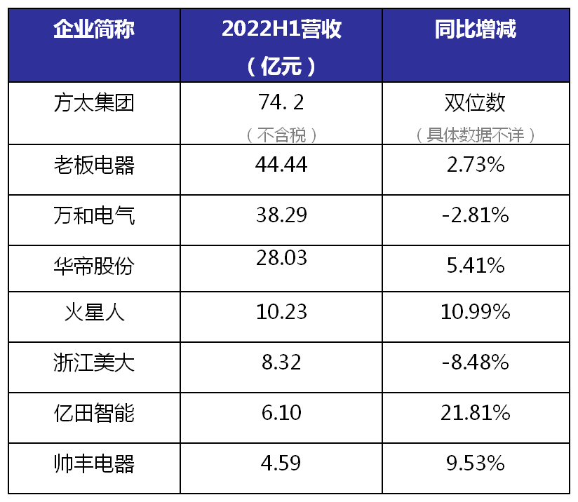 方太。2021年,方太集团营收155亿元,上榜中国制造业企业500强。今年上半年营收74亿多元,比排名第二的老板电器多了将近30亿元。