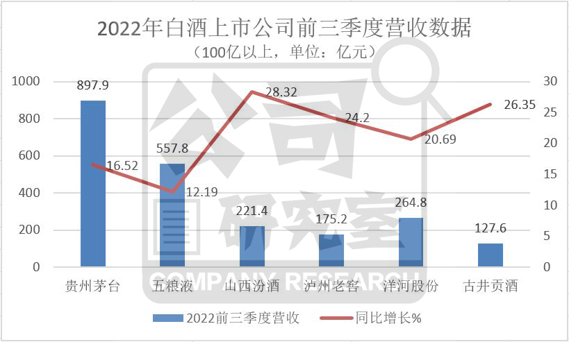 三季报显示,TOP6白酒前三季度营收同比增速均在两位数以上,其中,山西汾酒(600809.SH)、泸州老窖(000568,SZ)、洋河股份(002304.SZ)、古井贡酒(000596.SZ)同比增速均在20%以上,山西汾酒在去年同期营收大幅增长66.24%的情况下,三季度依然取得28.32%的增速,可见,在掌门人更换后,公司运营已在相对高位成功稳住;两家极品白酒贵州茅台、五粮液(000858.SZ)的增速相对较慢,贵州茅台16.52%,去年同期10.75%;五粮液12.19%,去年同期17.01%。显然,在白酒头部6家公司中,五粮液的营收增速同比相对逊色。