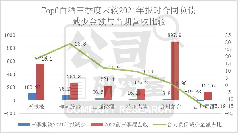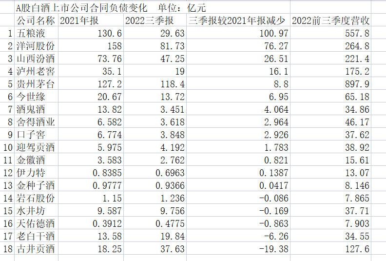 公司研究室统计了从2021年报到2022三季报期间,头部白酒公司的合同负债金额变化,这期间,合同负债减少金额最大的是五粮液,高达100.97亿元;其次是洋河股份76.2亿元;再次是山西汾酒26.5亿;接着是泸州老窖16亿,最后是贵州茅台8.8亿。