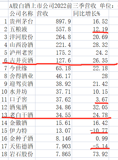 以营收规模为标准,对白酒公司进行分类,虽然有一些不同看法,但确实比较直观,简单易懂。从2022年三季报看,A股白酒板块18家上市公司(选取的都是营收几乎全是白酒作为收入的公司,顺鑫农业因为有25%的收入来自屠宰等其他行业,未列入;其他未列入的白酒板块公司,原因大致类似),明显分成三档:前三季度营收在100亿以上的6家,也就是与中国酒业协会近日就白酒股价波动发声的6家头部公司。