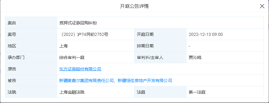天眼查App显示,近日,因新疆麦趣尔集团有限责任公司、新疆恒佳房地产开发有限公司下落不明,上海金融法院公告送达起诉状副本。公告显示,东方证券股份有限公司因质押式证券回购纠纷起诉上述两公司,请求法院判令被告一向原告偿还融资本金、违约金、利息及律师费共计约4.81亿元;原告有权对被告一质押给原告的股票及其孳息、不动产、建设用地使用权以拍卖、变卖等方式处置所得价款优先受偿;被告二以其名下建设用地使用权承担抵押担保责任。法院定于12月13日开庭审理此案。股东信息显示,新疆麦趣尔集团有限责任公司持有疆恒佳房地产开发有限公司约49%的股份。