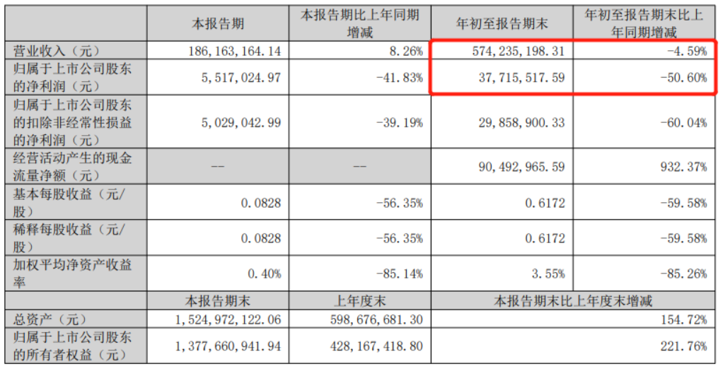 青木股份前三季度实现营业总收入5.7亿元,同比下降4.59%;实现归属于上市公司股东的净利润3772万元,同比下降50.60%。