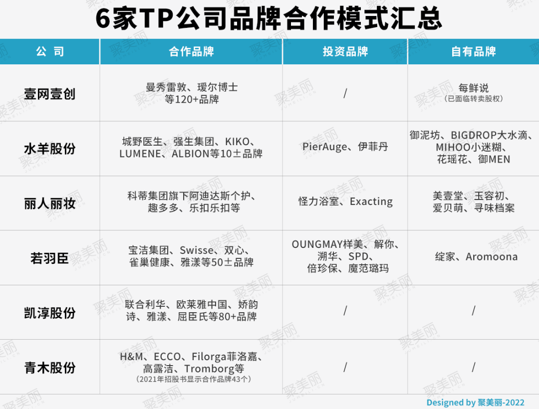 就这6大TP公司来看,目前正在普遍积极建立新的品牌代运营合作,如2022年以来,壹网壹创已新增37个品牌;在投资品牌之路上,今年以来水羊股份接连收购品牌PierAuge、伊菲丹,丽人丽妆已对外投资身体护理品牌怪力浴室、专柜级高端彩妆及皮肤护理品牌Exacting。