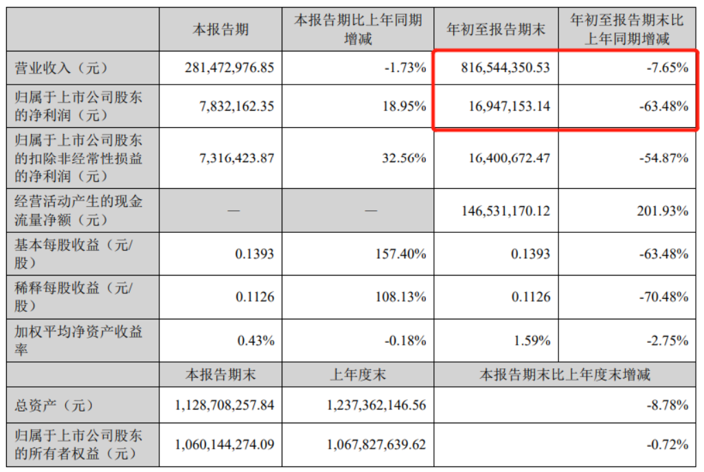 结合前三季度财报来看,凯淳股份第三季度营业收入有所回升,但前三季度总体仍呈现下降趋势,前三季度净利润则是保持了较大的下滑状态。