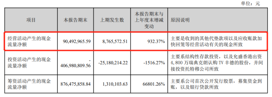 同时,青木股份前三季度经营活动产生的现金流量净额达9049.30万元,同比上升932.37%,其主要原因系“收到的其他代垫款项以及应收账款加快回笼等经营活动有关的现金所致。”