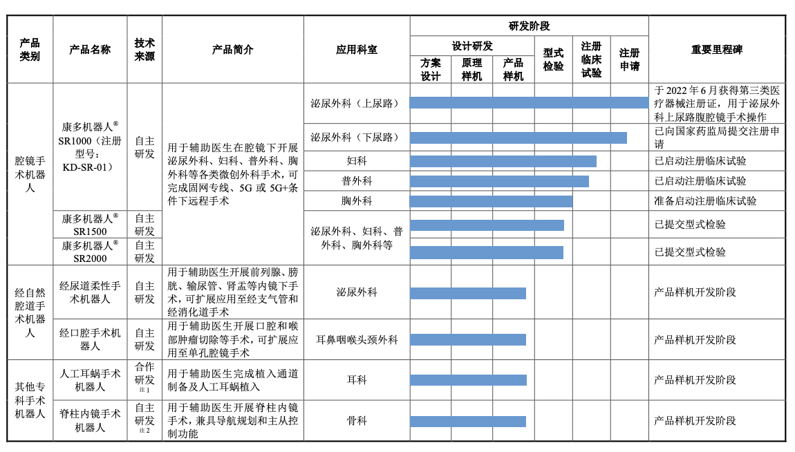 从在研产品进度来看,腔镜手术机器人的康多机器人® SR1000已完成泌尿外科上尿路注册临床试验并于2022年6月获得第三类医疗器械注册证。SR1000在泌尿外科下尿路的注册临床试验已于2022年8月完成,并已进入注册申请阶段,若该适应证获批后,SR1000可适用于全部泌尿外科腔镜手术操作。此外,SR1000在妇科和普外科的注册临床试验也已启动,目前处于受试者入组阶段。