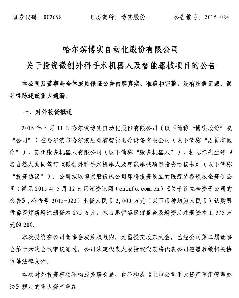 对此,界面新闻记者查询了博实股份的投资公告,以投资时思哲睿的股权结构显示,博实股份系公司最早的外部投资者,以投资2000万元持股20%计算,彼时思哲睿的估值为1亿元。此次投资后,博实股份再无动作。