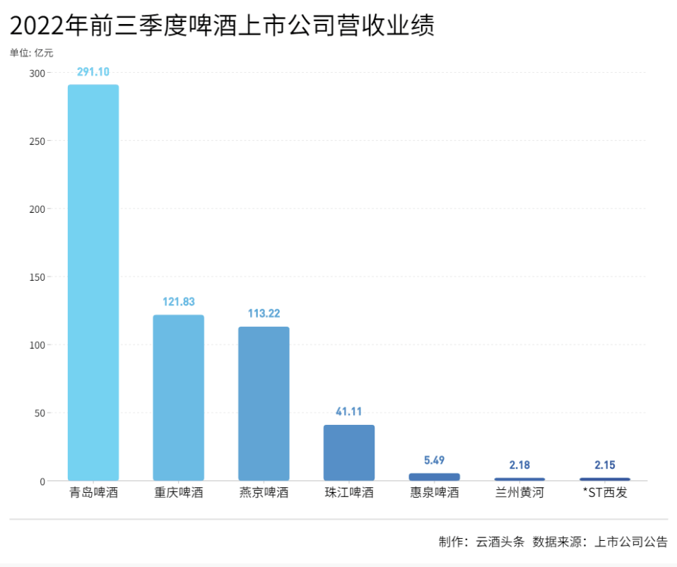 但据近期各啤酒企业发布的三季报数据显示,截至10月30日,青岛啤酒、重庆啤酒、燕京啤酒、珠江啤酒分别以291.10亿元、121.83亿元、113.22亿元、41.11亿元的成绩实现了前三季度总营收的同比正增长,这表明啤酒行业已在逐渐回暖。