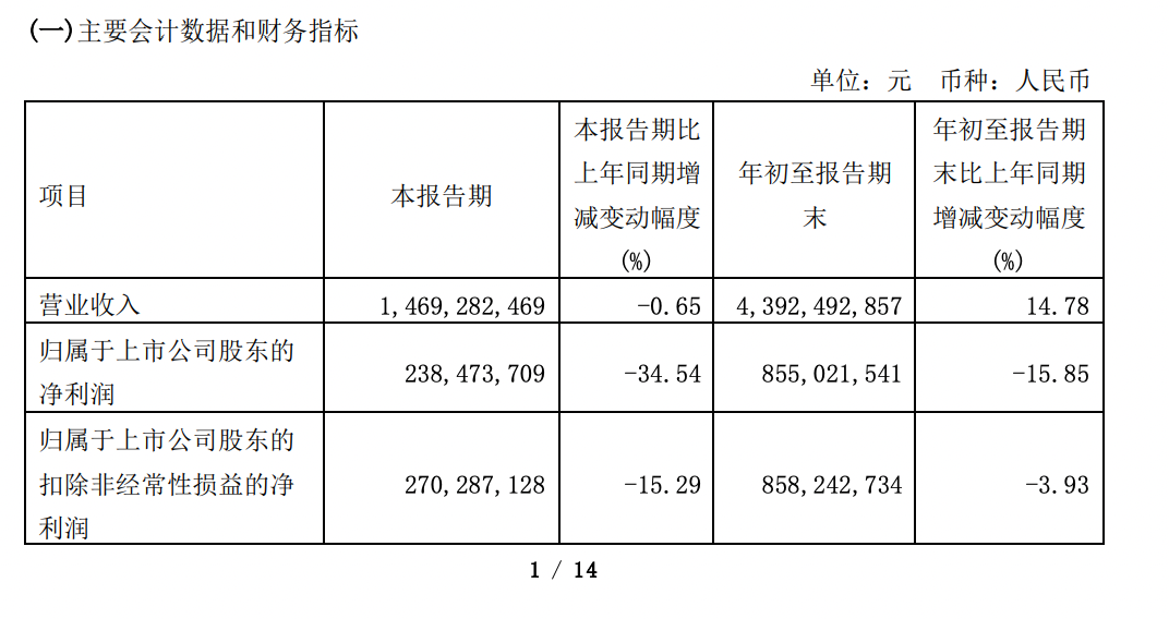 10月31日,石头科技发布了2022年第三季度财报。财报显示,石头科技三季度的营收为14.69亿元,同比下降0.65%;归属于上市公司股东的净利润为2.38亿元,同比下降34.54%。