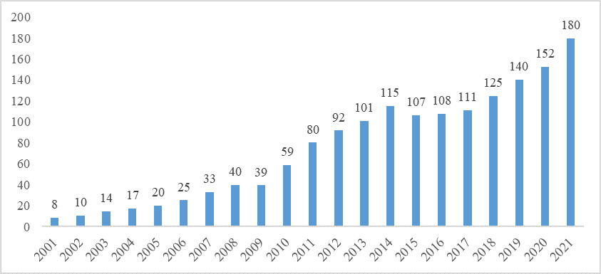 从人均进口(总进口额与年末总人口之比)来看,中国人均进口额从2001年的191美元增长至2021年的1903美元,2021年是2001年的近10倍,是2012年的1.4倍。人均消费品进口额由2001年的8美元增长至2021年的180美元,2021年是2001年的22.5倍,是2012年的近2倍。