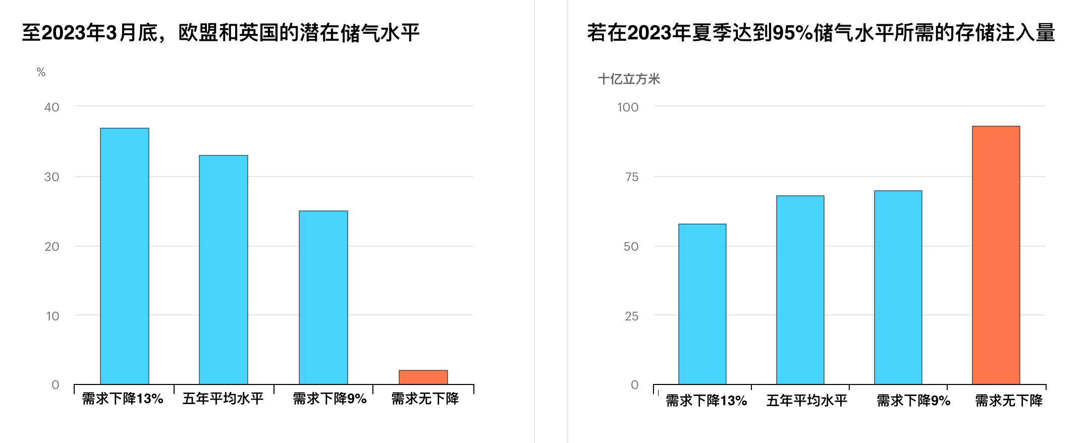根据今冬需求程度的不同,IEA预计,今年供暖季末的欧洲储气水平将降至5%-35%之间。若要在明年夏季保持95%的储气水平,还需注入天然气600亿-900亿立方米。