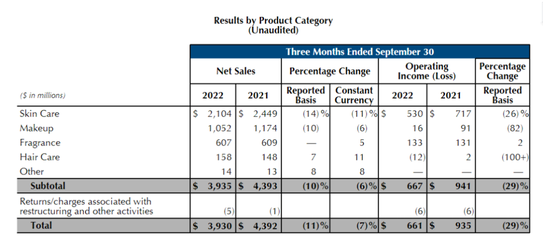 财报表明,按产品类别划分,护肤产品净销售额为21.04亿美元(约合人民币153.95亿元),同比下降14%;彩妆净销售额为10.52亿美元(约合人民币76.97亿元),同比下降10%;香水产品净销售额为6.07亿美元(约合人民币44.41亿元),与上年同期基本持平;护发用品净销售额为1.58亿美元(约合人民币11.56亿元),同比增长7%。