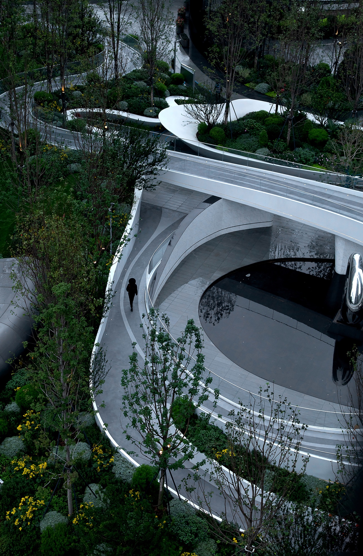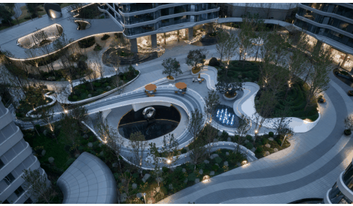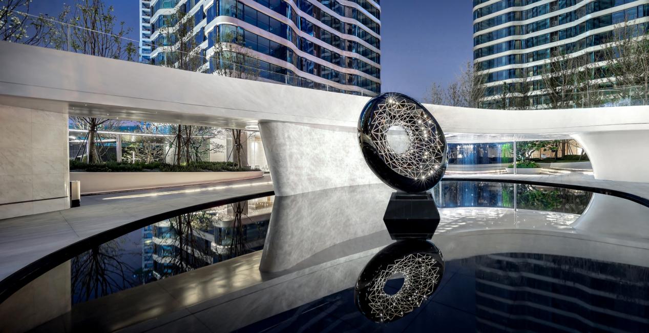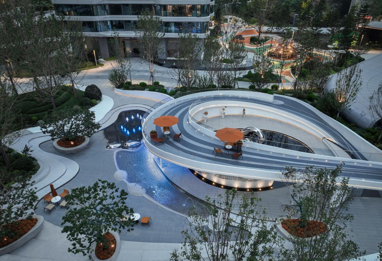 当视线由仰望改为平视,便是植物与水景错落的园区景观构成的中庭园林,设计理念取自易经的“天圆地方”,以水脉为路,因形就势勾勒出场地的高地起伏,自然地围合出不同功能空间,成就精致立体园林丰富的层次感与尊贵感。