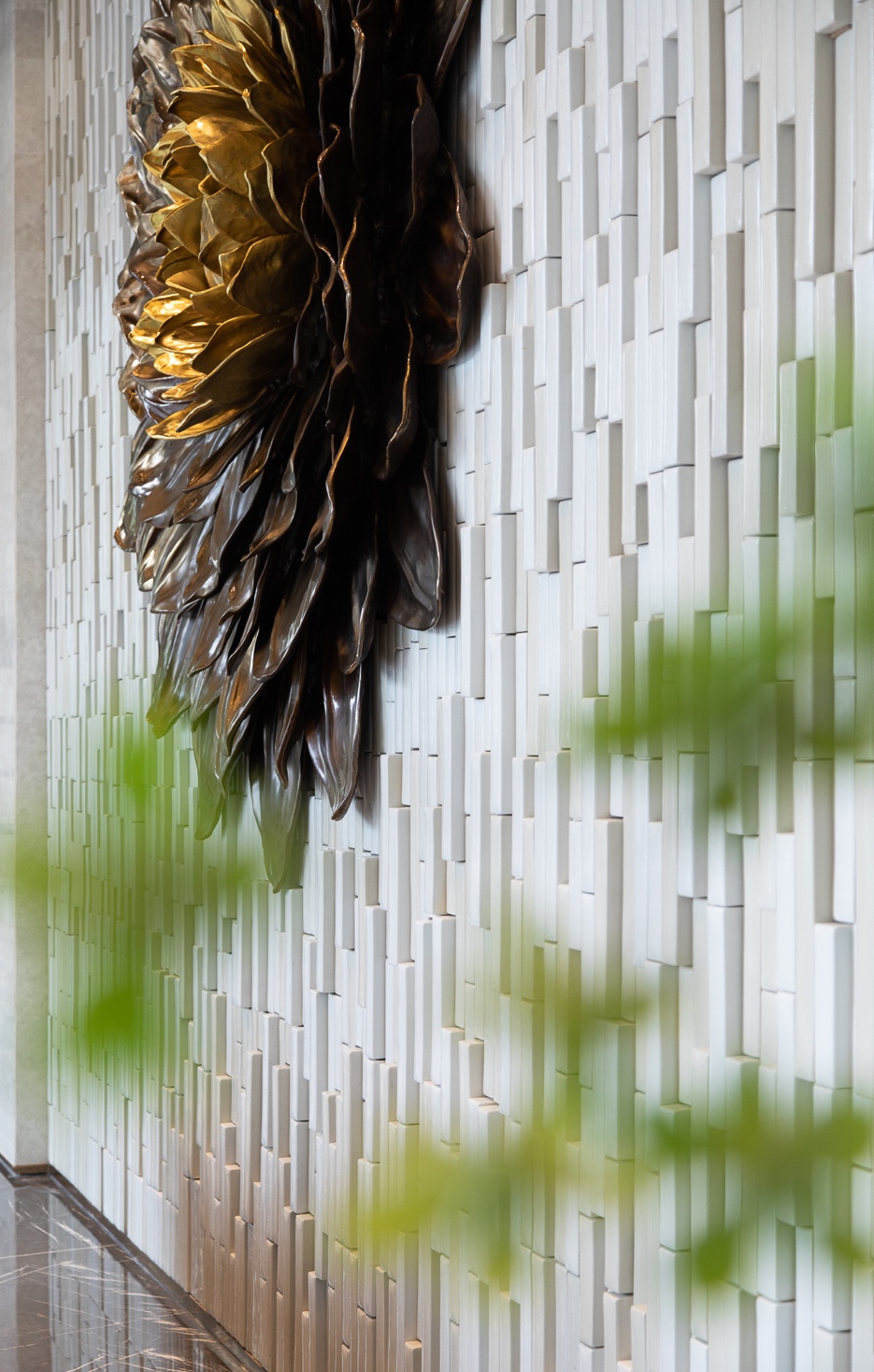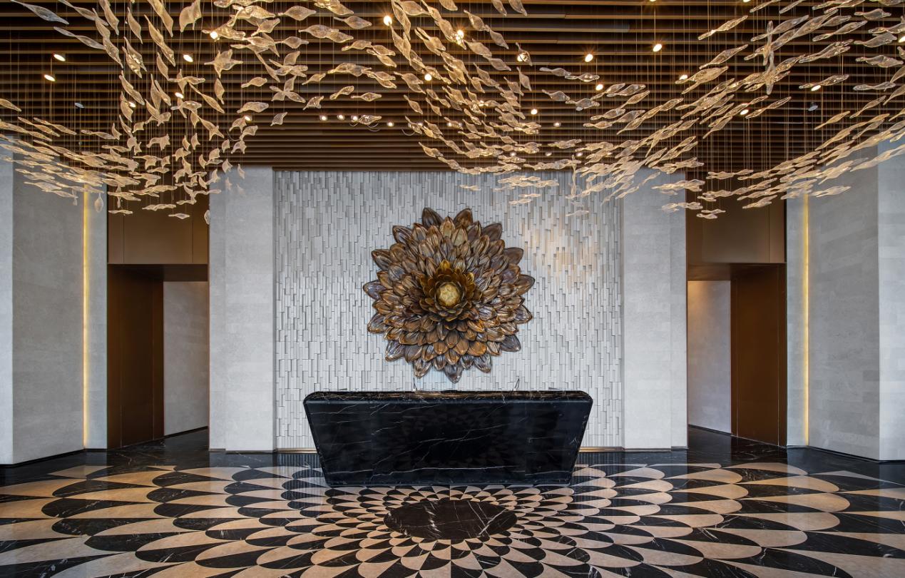 走进楼栋公区大堂,目光会不自觉地被巨大的陶瓷大丽花装饰吸引,它由景德镇陶瓷世家为项目独家高温锻造,用陶瓷的技艺呈现出一种后现代艺术风格的金属质感,让整个大堂显得时尚且典雅。