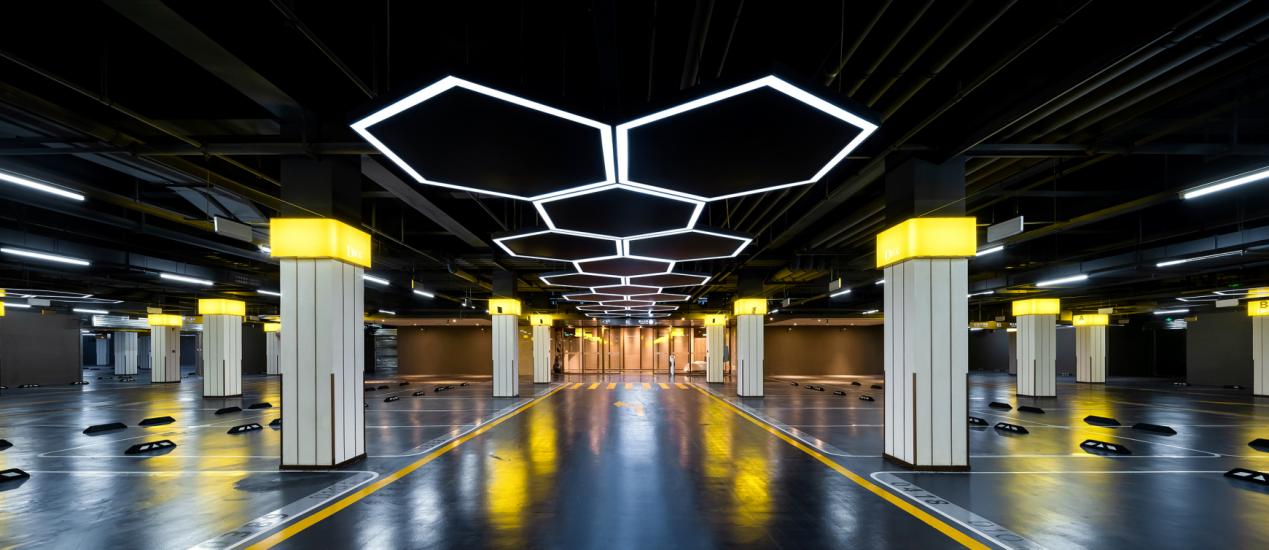 地下车库是藏在细节里的光,D10天府地下停车体系的PSR坡道工法(专为超跑设计7.5%保护弧坡),同时柱子规避了传统的单一刷漆手法,采用导视灯箱加金属线条造型,将空间矜贵的调性拔高。