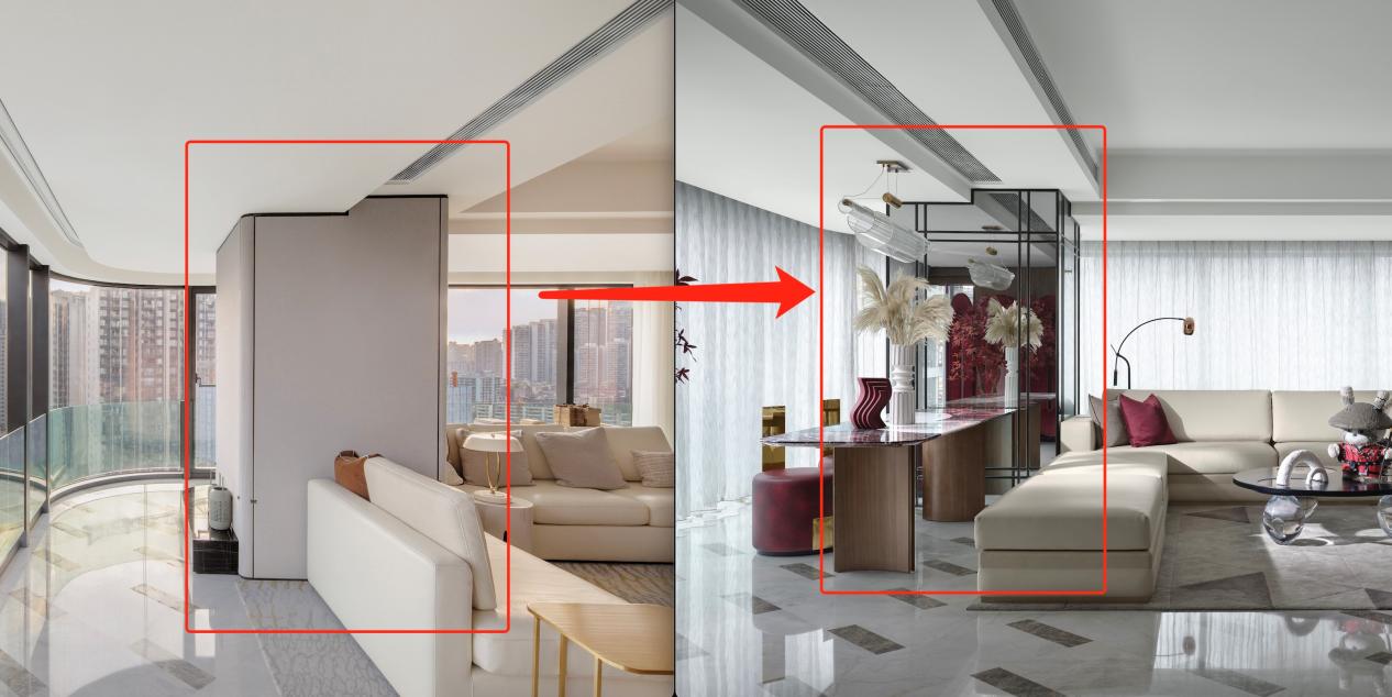 在样板间亮相之后,为了更好的产品呈现与居住体验,D10天府把布面的柱体交付标准提升成了镜面,视觉效果一下变得开阔大气。