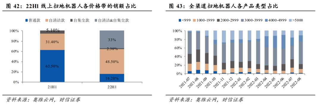 根据奥维数据,从价格带来看,22年8月的3000元以上扫地机器人销额占比达到了77.03%,同比增长34.41pct,中高端价格带份额提升速度非常快,随着自集尘、自烘干、自动上下水等更自动的功能应用和完善,接下来全能扫地机器人占比有望进一步提升,价格带有望向中高档价格集中。