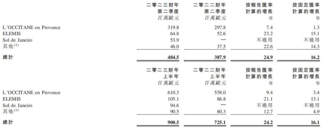 分品牌来看,按报告汇率计算,欧舒丹同名品牌销售额在2023财年上半年同比增长9.4%,按固定汇率计算增长3.4%。ELEMIS同样表现良好,按报告汇率计算增长21.1%,按固定汇率计算增长13.1%。作为去年收购的新品牌,Sol de Janeiro期内录得销售额9460亿欧元,与去年同期相比,按本地货币计算增长超过65%。