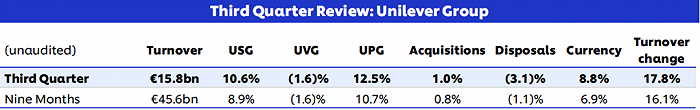 该季度联合利华基础销售额增长(USG,即指这一时期的营业额增长,包括由资产收购、处置、货币变动以及恶性通货膨胀引起的超26%的价格增长所导致的营业额改变)为10.6%,基础价格增长(UPG)为12.5%,基础销量增长(UVG)为-1.6%,即下降了1.6%。