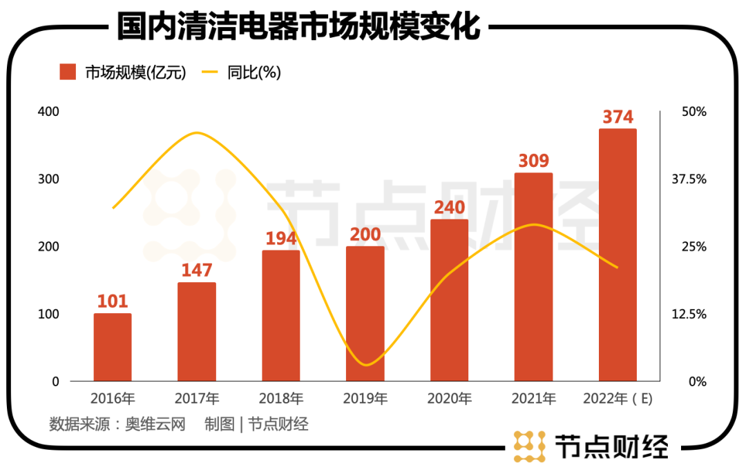 另外,从整个清洁电器板块的扩容趋势看,2016年—2021年,其行业总规模从101亿元增长至309亿元,年复合增速为25%,这一增速与化妆品及一些新消费赛道的增速相差不大。