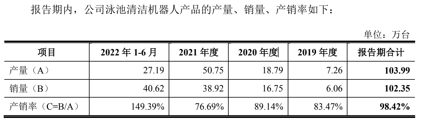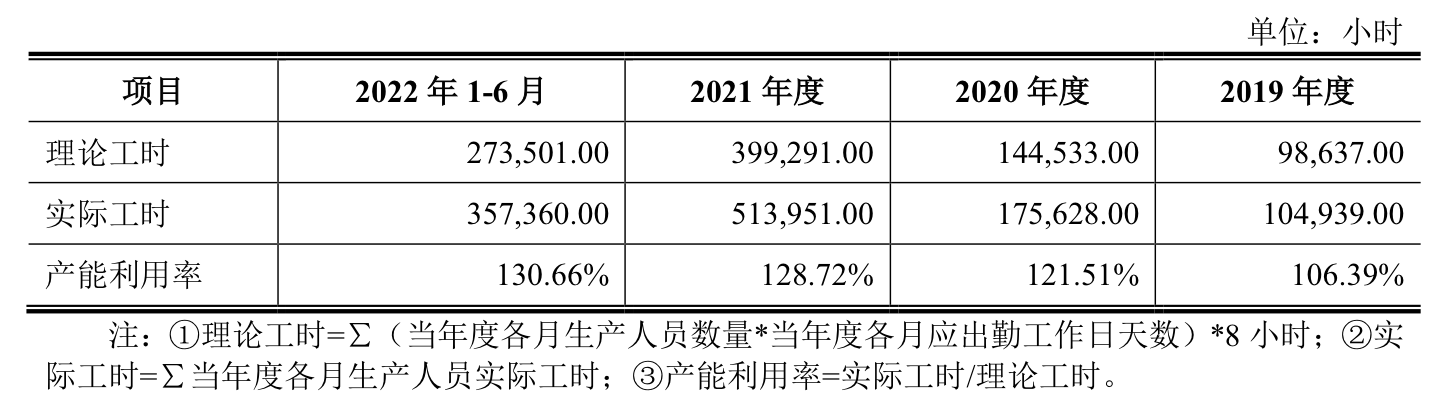 望圆科技的产能利用率是用工时来计算的,2022年上半年,望圆科技理论工时为27.35万小时,实际工时为35.74万小时,这样产能利用率就是130.66%。每年的6-8月为生产淡季,报告期内的产销率为98.42%。产量的话,2021年和2022年上半年的产量分别为50.75万台和27.19万台。