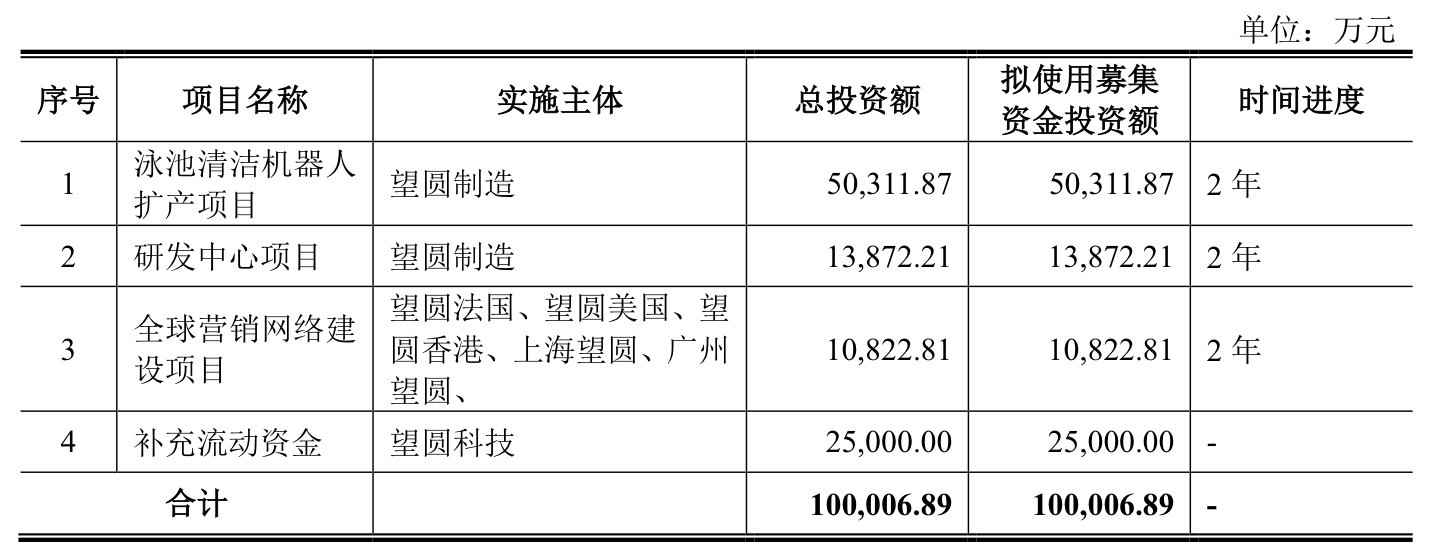 此次,望圆科技打算募资10个亿,投入到“泳池清洁机器人扩产项目”、“研发中心项目”、“全球营销网络建设项目”、“补充流动资金”,投入金额分别为5.03亿元、1.39亿元、1.08亿元、2.5亿元。