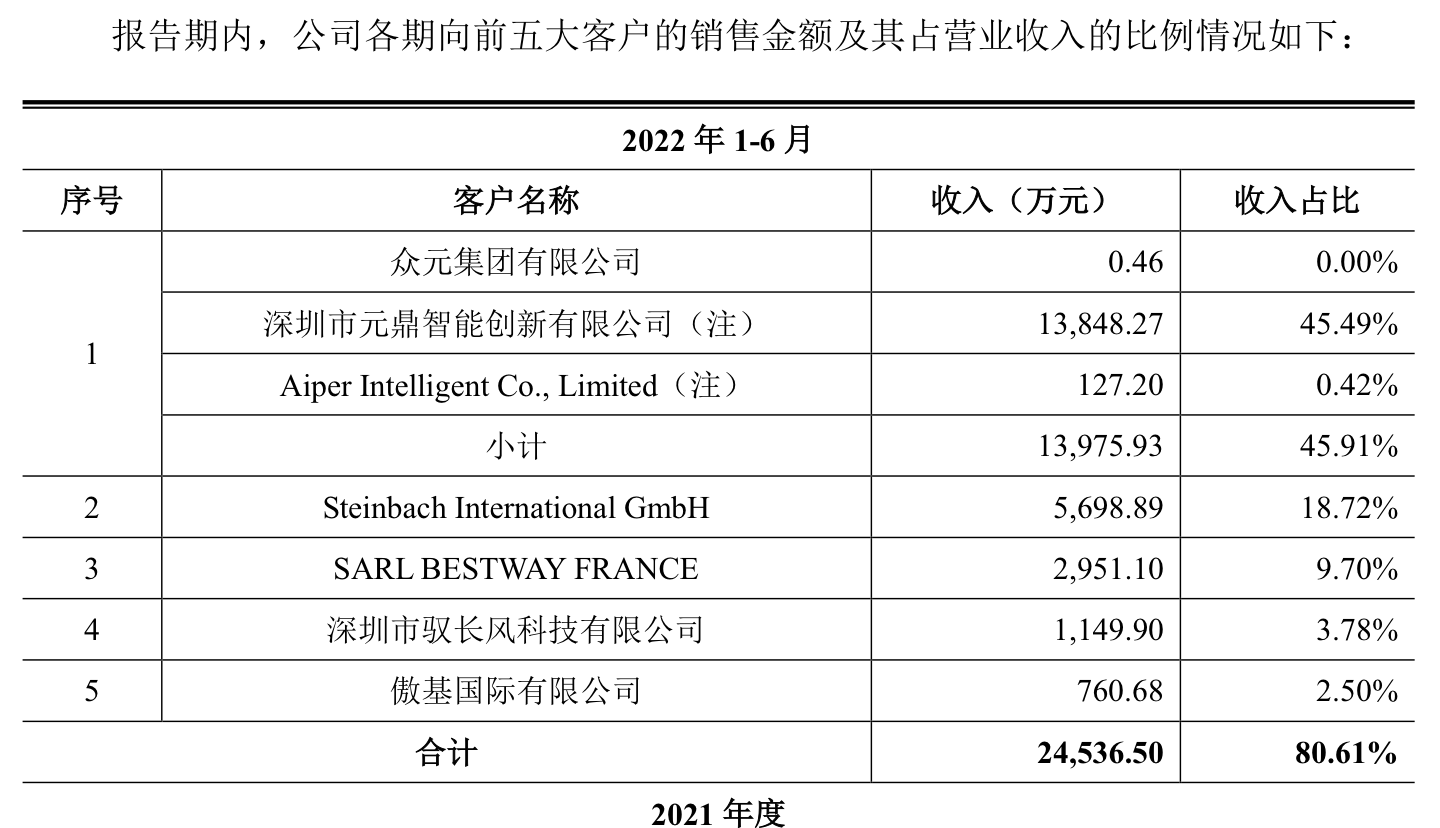 另外,望圆科技对大客户据有严重依赖,2022年上半年来自前五大客户的收入占比高达80.61%。