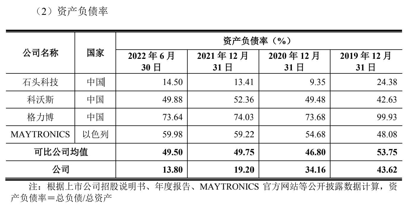 招股说明书显示,望圆科技2019年至2021年的“分配股利、利润或偿付利息支付的现金”分别为96.24万元、65.92万元、8526.11万元。很明显,2021年望圆科技进行了大额分红,这也导致2021年未分配利润锐减到542.12万元。不过到了2022年上半年该数据又提升到了1.09亿元。2022年上半年底公司的货币资金也有1.82亿元,上半年的资产负债率更是在13.8%,低于行业平均。