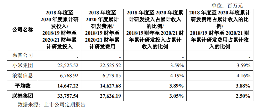 美股上市的小米集团在2018年至2020年的累计研发投入占累计收入比例为3.59%,而深交所主板上市的浪潮信息为4.19%。同期内,这两家公司的研发投入占比都比联想集团高。