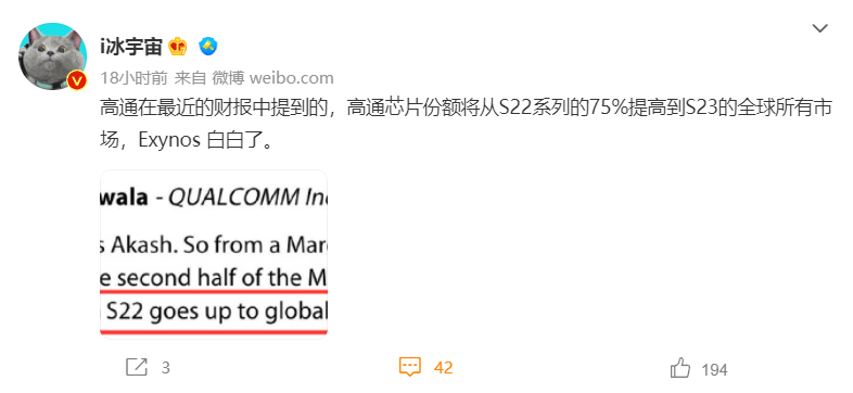现在,这则半年前的爆料被证实了,消息来源是国内著名三星粉丝兼数码博主@i冰宇宙。该博主称,高通最新财报显示,三星Galaxy S23系列高通芯片的份额将从S22系列的75%提升至100%。
