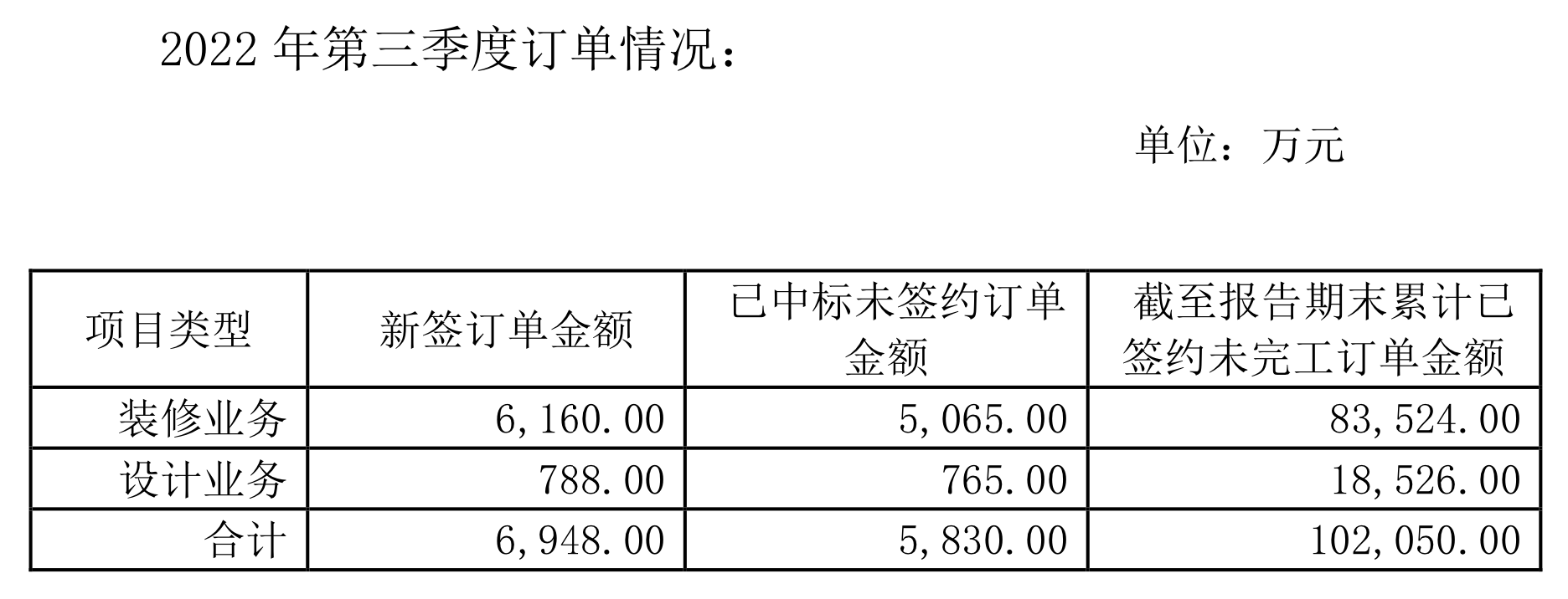 值得注意的是,在10月31日,上市公司披露了2022年第三季度报告,公司前三季度收入共计10574.71万元,实现归母净利润-6635.90万元。其中,第三季度实现营业收入4835.69万元,同比大幅增长63.84%,占前三季度收入比达45.73%。2022年第三季度新签订单为6948万元,已中标未签约订单有5830万元。ST弘高的主营业务为工程设计、景观设计、家具设计、工艺美术品设计和建筑装修装饰工程专业承包。