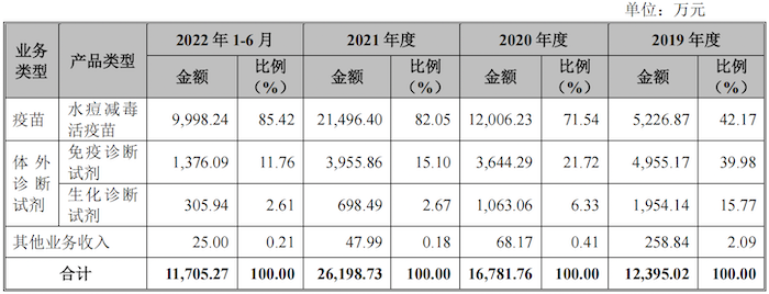 招股书显示,荣盛生物是从事疫苗及体外诊断试剂的研发、生产和销售的高新技术企业,产品主要用于传染病的预防和诊断。公司收入主要来源于疫苗业务收入和体外诊断试剂业务收入。
