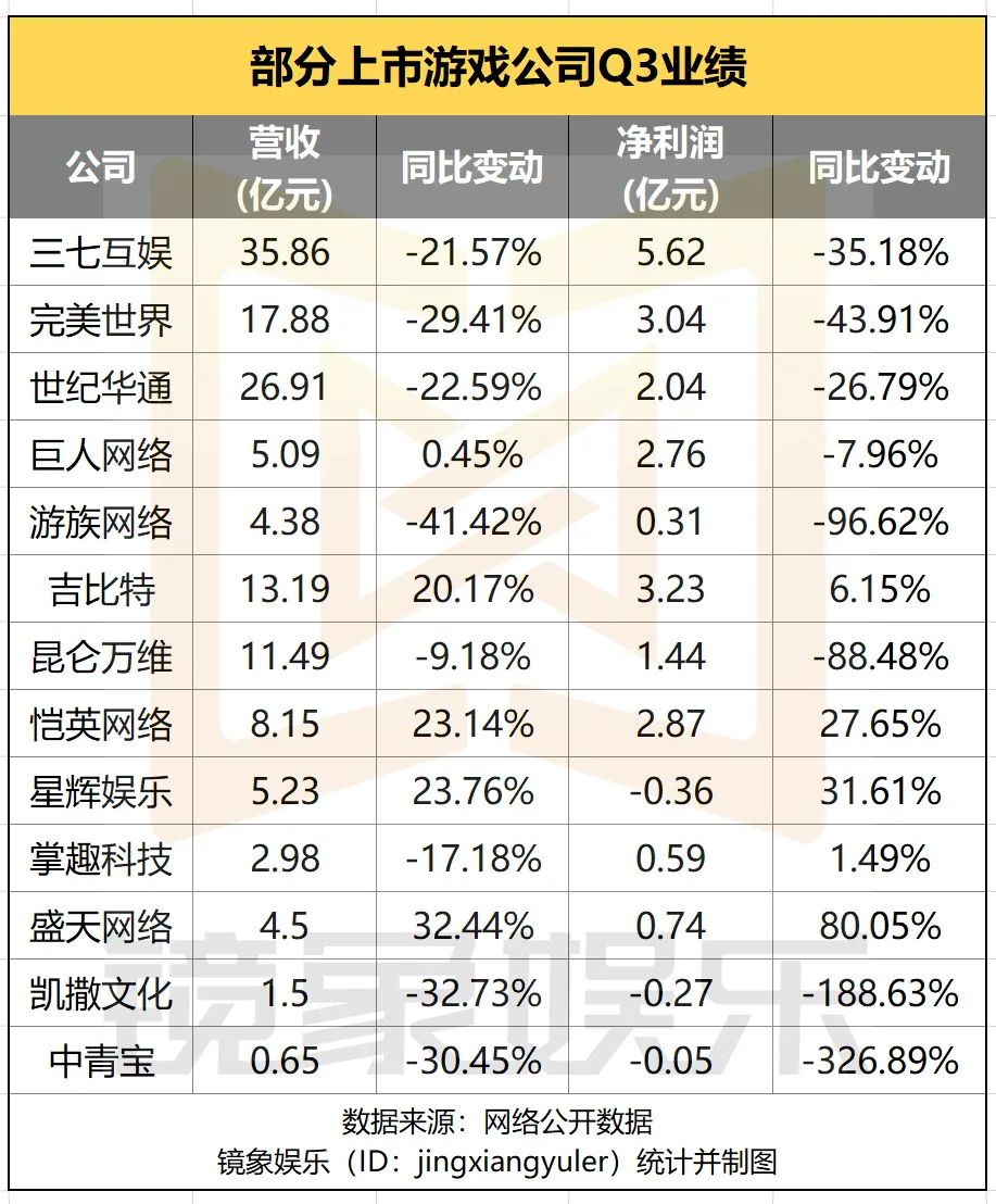 近日,A股上市游戏公司陆续发布了三季度财务报告,单从业绩表现来看,多家公司都出现了同比下滑的态势。在镜象娱乐统计的13家A股上市游戏公司中,包括三七互娱、完美世界、世纪华通、游族网络等在内的8家公司营收和净利润同比下滑。