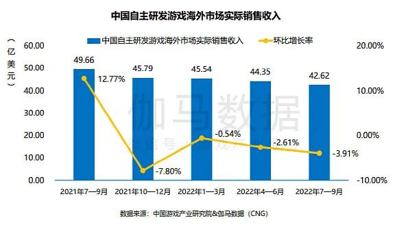 伽马数据显示,今年第三季度,中国自主研发游戏海外市场实际销售收入42.62亿,同比下降3.91%。值得注意的是,该数据至今已连续4季度出现下滑。