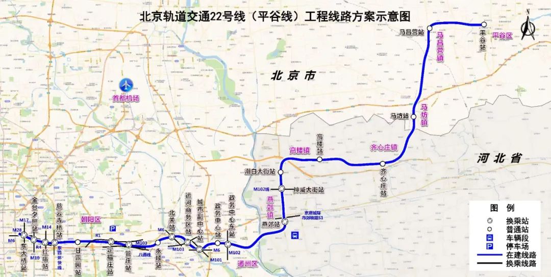 北京地铁22号线于2015年获国家发改委批复,2016年底曾宣布开工,但因方案调整而暂停建设。2019年,国家发改委对北京地铁22号线作出调整,向南移动经过城市副中心,同时增加了河北省内的站点。
