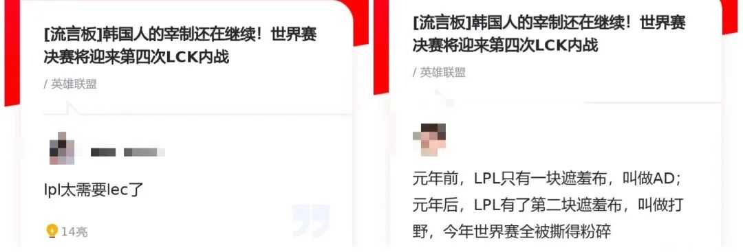 另外一场半决赛是LCK一号种子和四号种子的内战,在JDG被淘汰后,网上流传着这样的段子:对于“元年粉”(2018年后接触LOL赛事的观众)来说,他们的青春结束了,但对于LPL的“老粉”来说,这次青春是真的回来了——“欢迎回到LPL的黑暗时代”。