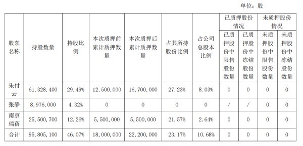 另外,朱付云与其一致行动人张静,以及由其担任执行事务合伙人的南京瑞蓓创业投资管理中心(有限合伙)(简称“南京瑞蓓”)合计持有亿嘉和的9580.51万股,占公司总股本的46.07%。在本次补充质押部分股份后,朱付云及其一致行动人、实际控制企业南京瑞蓓累计质押股份2220万股,占合计所持公司股份总数的23.17%,占公司总股本的10.68%。