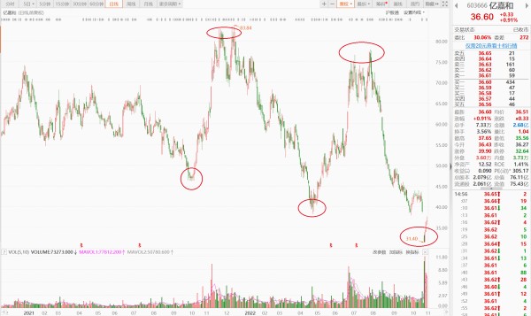 值得注意的是,亿嘉和的股价已经连续下跌了3个月。8月2日,亿嘉和股价触及阶段性高点77.91元之后,突然调转方向出现连续下跌,到11月1日收盘价31.40元,每股跌去46.51元,区间跌幅达59.70%。实际上,近一年以来,从2021年10月中旬开始,亿嘉和股价出现了数次大起大落,“过山车”行情连续上演。