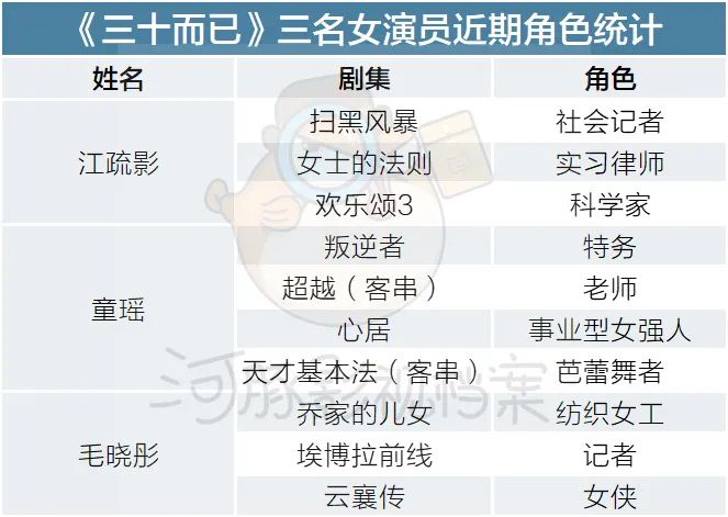 以刚刚收官的《芳心荡漾》为例,三名不同年龄不同阶层女性的群像剧,通常会有一名较为年轻可爱的少女角色担当,在该剧中就是郑合惠子饰演的罗潇潇,与《三十而已》里毛晓彤的钟晓芹和《她们的名字》里薇薇安饰演的沈嘉男具有相似的人物功能,“不介意番位和真的想与姐姐们学习一下拍摄气氛的年轻女演员,可尝试拿下这类角色”。