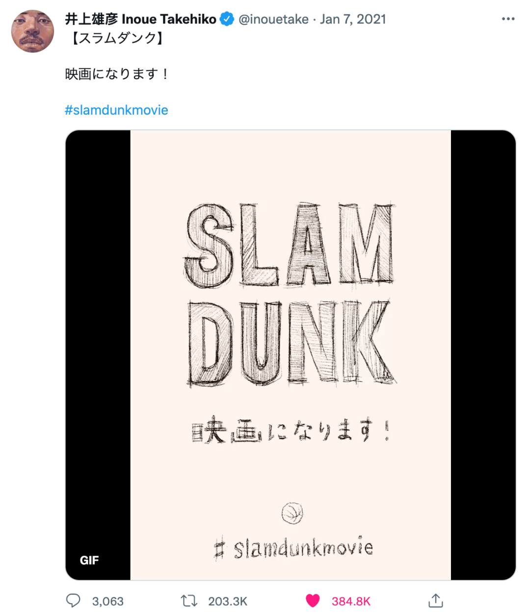 2021年1月7日,井上雄彦在个人社交账户上推送了这样一条日语动态。看不懂日语的漫画迷,从下方附带的话题标签 #slamdunkmovie 上,得到了那个爆炸性的消息:《灌篮高手》,要出电影了。