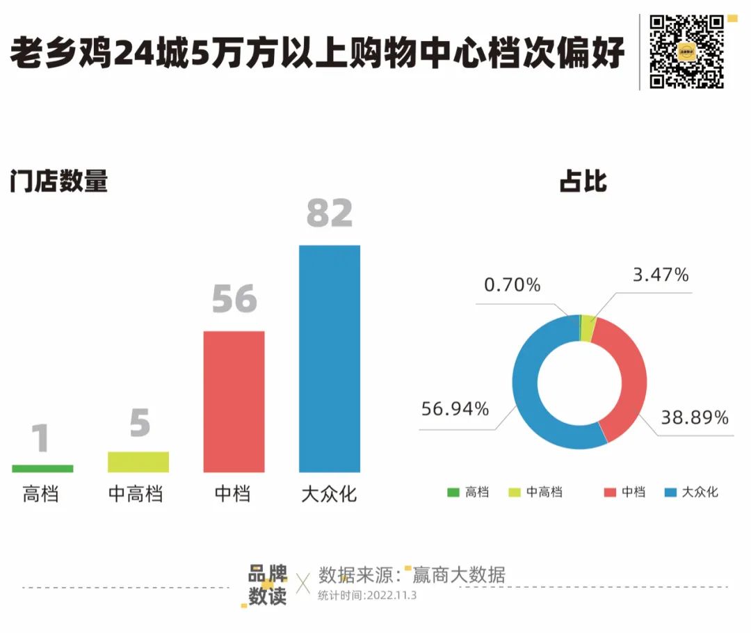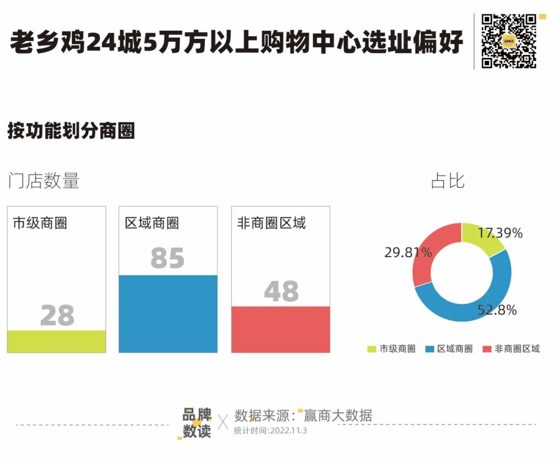 根据赢商大数据显示,在24城5万方以上购物中心门店中,老乡鸡更喜欢区域型商圈,占比达到52.8%。在入驻的商圈中,成熟商圈的占比也更高,达到56.52%。