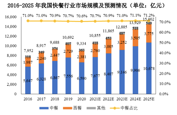根据弗若斯特沙利文报告,2020年我国快餐行业收入达9334亿元,2016-2020年均符合增长率为4.1%。在我国拥有14亿人口的消费基础上,随着城市化水平的提高及消费者对食品安全及快捷方便的追求,未来我国快餐市场将持续增长。预计2025年,我国快餐行业市场规模将突破15000亿元。
